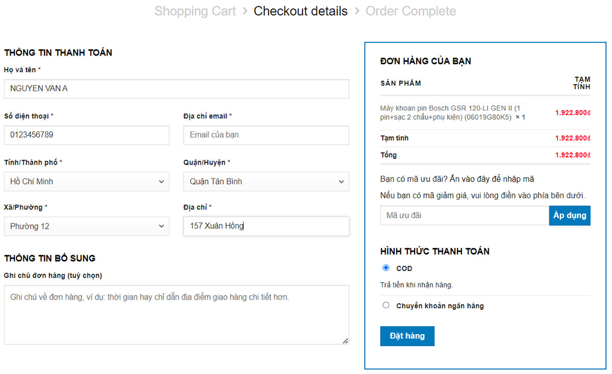 + Kiểm tra lại số lượng sản phẩm, điền đầy đủ thông tin thanh toán sau đó chọn phương thức thanh toán và chọn nút “Đặt hàng” là bạn đã thành công đặt đơn hàng