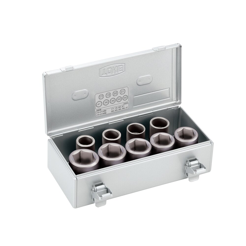Bộ đầu khẩu A609T TONE có 9 đầu với hình dạng 4 cạnh và 6 cạnh, hệ đo lường milimet, thích hợp cho nhiều loại bu lông công nghiệp.