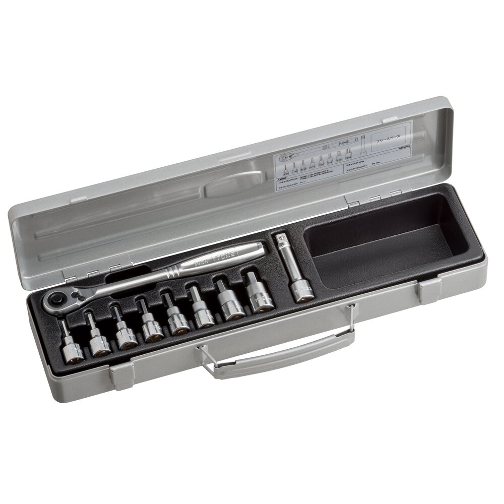 Bộ đầu khẩu lục giác HB3082 TONE giúp thợ bảo trì giảm thời gian đổi đầu khi làm việc với bu lông inch, nhờ bộ 10 đầu tích hợp trong kích thước 406x120x60mm.