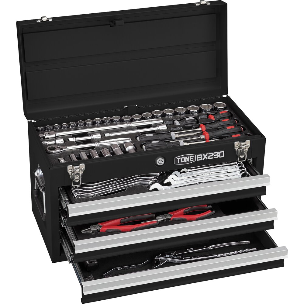 - Bộ dụng cụ TSA350BK TONE có 72 chi tiết giúp thợ cơ khí xử lý đa dạng công việc từ siết ốc, tháo lắp đến điều chỉnh thiết bị trong xưởng gia công, giảm thời gian tìm kiếm dụng cụ.