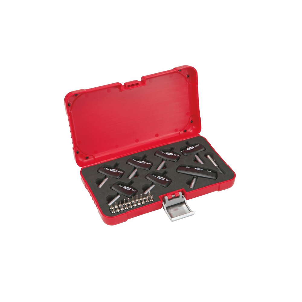 Bộ thanh vặn TGS20 TONE gồm 28 chi tiết, bao gồm các đầu cắm bit và thân vặn, đáp ứng nhiều kích cỡ bu lông.