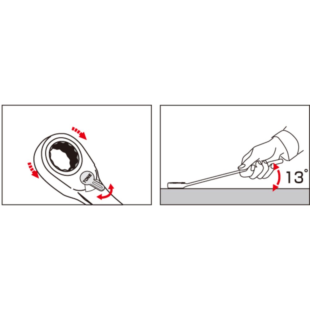 Cờ lê đầu chòng cơ cấu ratchet RMR-07 TONE giúp tiết kiệm thời gian nhờ cơ cấu vặn không cần nhấc đầu, giảm mỏi tay với khối lượng 35g và tăng độ an toàn nhờ thiết kế 12 cạnh giảm trơn trượt, đặc biệt trong các ca bảo trì dài.