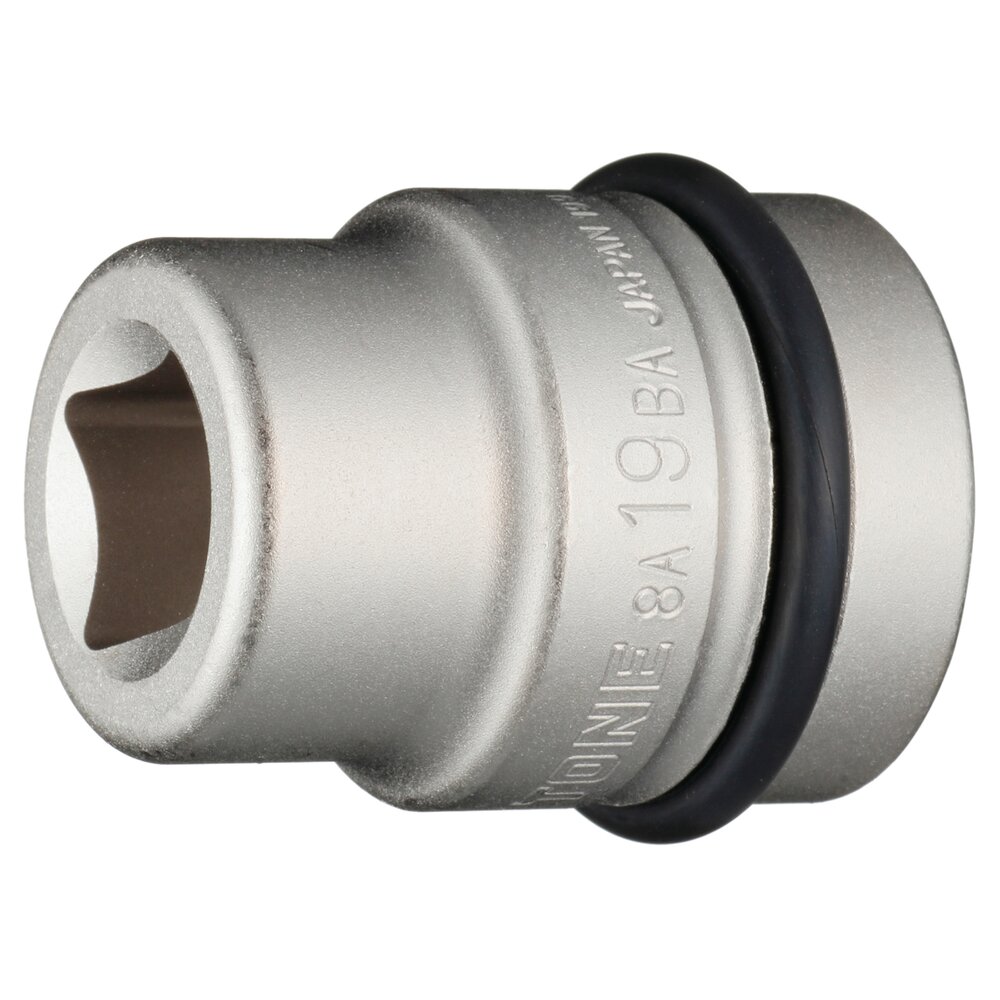 Đầu khẩu 8A-19BA TONE có góc cắm 25.4mm (1 inch), hình dạng đầu 4 cạnh, kích thước tiêu chuẩn chiều rộng hai mặt 19mm, làm từ thép kết cấu, xử lý bề mặt mạ điện không điện phân, khối lượng 530g, kích thước 48x48x61mm, phù hợp chốt P4033S và vòng O RAS326S.