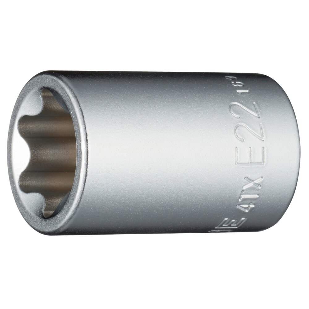 - Hình dạng đầu Torx loại E của Đầu khẩu bông 4TX-E22 TONE giúp truyền lực hiệu quả lên bu lông, giảm trượt mấu so với đầu sao loại T.