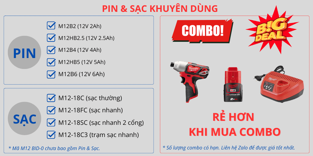 Milwaukee M12 BID-0 dùng pin sạc gì?