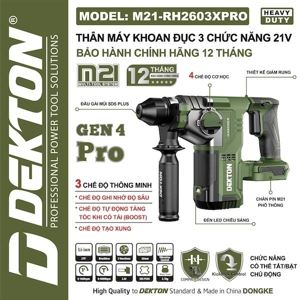 Review Máy khoan bê tông dùng pin 21V Dekton M21-RH2603XPRO (Chưa Pin & Sạc)
