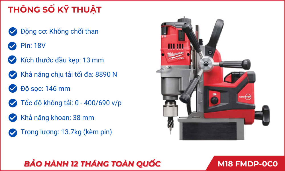 - Khả năng khoan sâu và đường kính lớn: Máy có khả năng khoan sâu tối đa lên đến 50mm và đường kính khoan tối đa là 38mm, cho phép thực hiện các nhiệm vụ khoan phức tạp trên các vật liệu cứng như thép.
