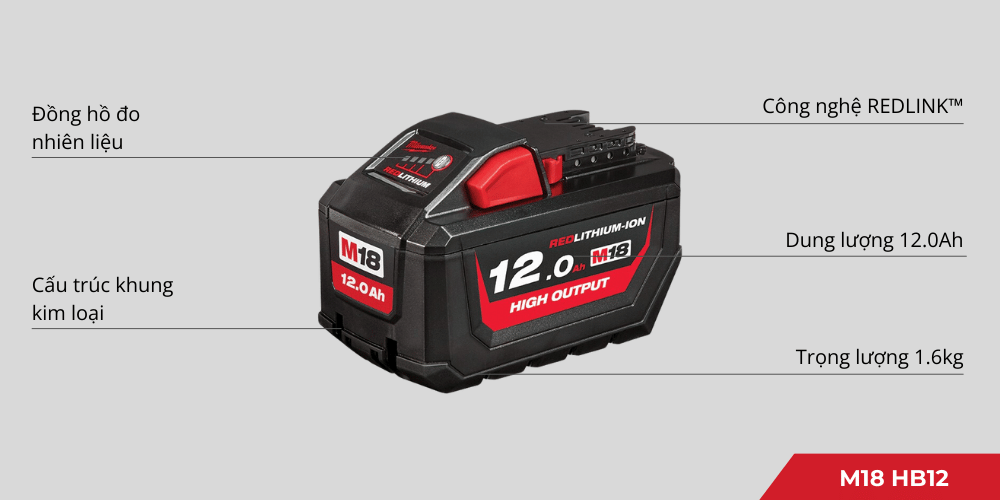 Pin Milwaukee M18 HB12 là sản phẩm pin lithium-ion cao cấp với điện thế 18V và dung lượng 12.0Ah, được thiết kế để cung cấp hiệu suất mạnh mẽ cho các dụng cụ điện cầm tay không dây. Với khả năng cung cấp năng lượng cao hơn tới 50% so với các loại pin M18 REDLITHIUM thông thường, pin này giúp kéo dài thời gian hoạt động của thiết bị trong các công việc yêu cầu cường độ cao.