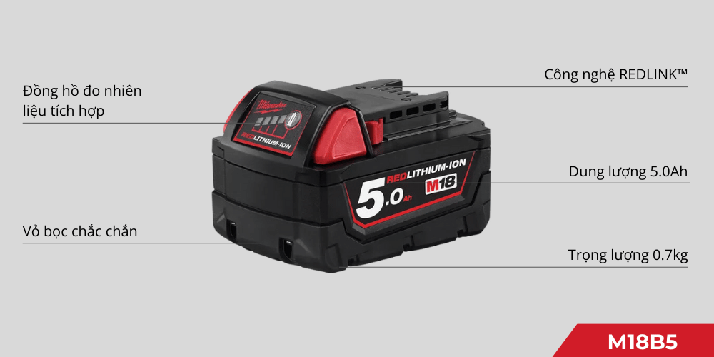 Pin Milwaukee M18B5 là một sản phẩm pin lithium-ion 18V với dung lượng 5.0Ah, nổi bật với khả năng cung cấp thời gian sử dụng lâu hơn gấp 2,5 lần và công suất cao hơn 20% so với các loại pin tiêu chuẩn khác. Sản phẩm này được thiết kế với công nghệ REDLITHIUM™ và REDLINK™ Intelligence, giúp bảo vệ pin khỏi quá tải và nhiệt độ cao, đồng thời tối ưu hóa hiệu suất làm việc.