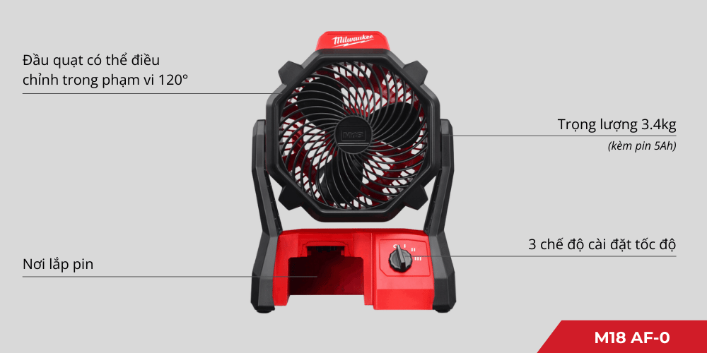 Milwaukee M18 AF-0 là một quạt chạy pin đa năng, thiết kế nhỏ gọn và tiện lợi, phù hợp cho nhiều nhu cầu sử dụng. Sản phẩm sử dụng pin M18™ REDLITHIUM™-ION, cho phép hoạt động cả bằng nguồn điện AC hoặc pin, mang lại tính linh hoạt cao.