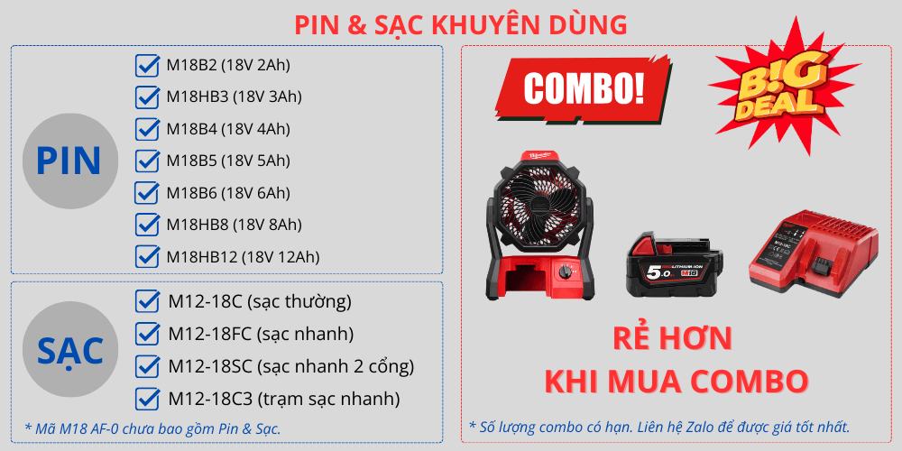 Quạt chạy pin Milwaukee M18 AF-0 sử dụng được tất cả pin sạc 18V của hãng gồm có các mã sau: